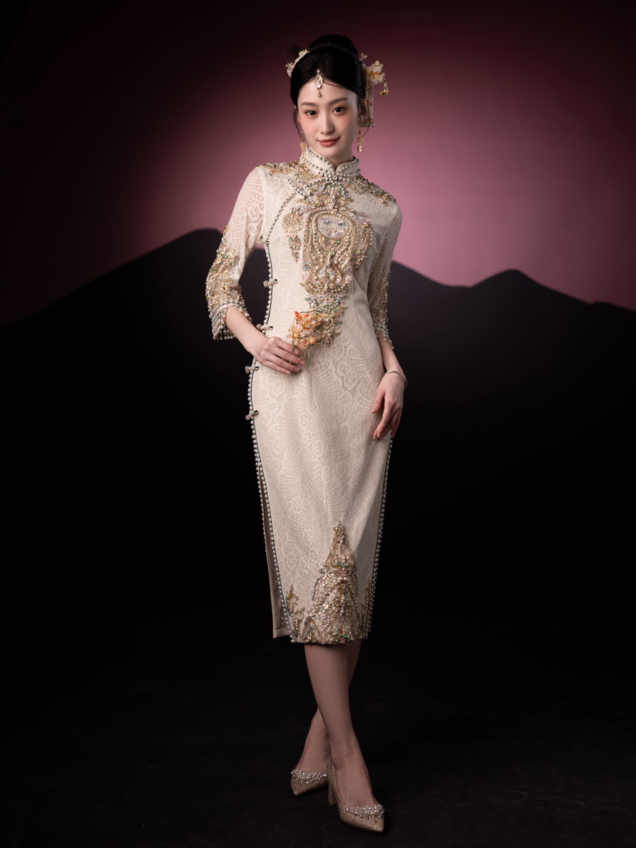 This exquisite Qi Pao (Cheongsam) is a perfect blend of elegance and artistry. The dress features delicate lace fabric adorned with intricate beadwork and pearl embellishments that shimmer beautifully. The vibrant embroidery, with gold and jewel tones, creates a mesmerizing effect, while the mandarin collar and side slits offer a graceful and flattering silhouette.