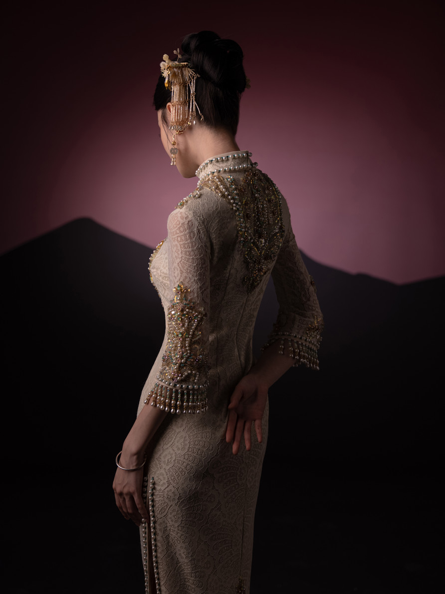 Detailed with cascading beads along the hem and sleeves, this Qi Pao is the epitome of traditional glamour with a modern touch. Ideal for weddings, galas, and festive events, this dress brings luxury and sophistication to any occasion.