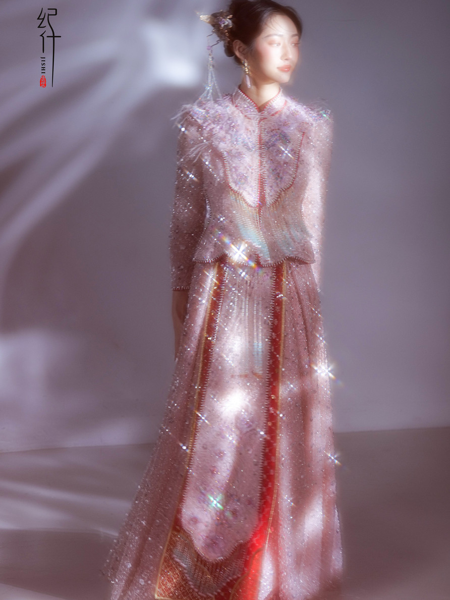 This radiant Chinese Qun Kwa reimagines tradition with modern artistry. Drenched in a delicate blush hue, the gown is exquisitely embellished with shimmering sequins, beads, and hand-embroidered floral appliqués that dance across the fabric like stars in twilight.