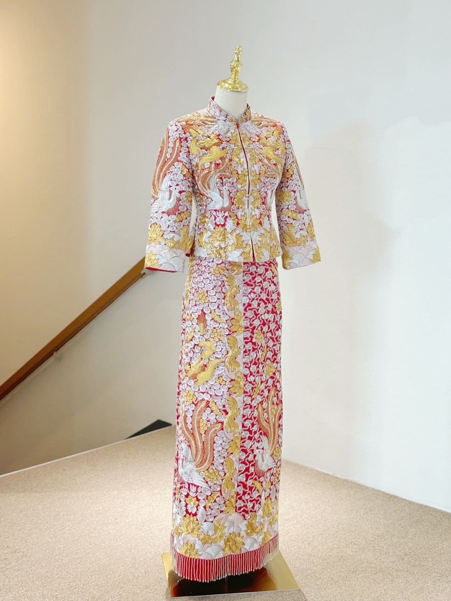 At the heart of the design are resplendent golden phoenixes and peonies—emblems of grace, prosperity, and enduring love. The finely tailored jacket features a subtle fit-and-flare silhouette, paired with a sleek floor-length skirt adorned in symmetrical, full-bodied motifs. Rows of metallic gold threads and sequins shimmer with every step, capturing the light and drawing attention to its exquisite craftsmanship.