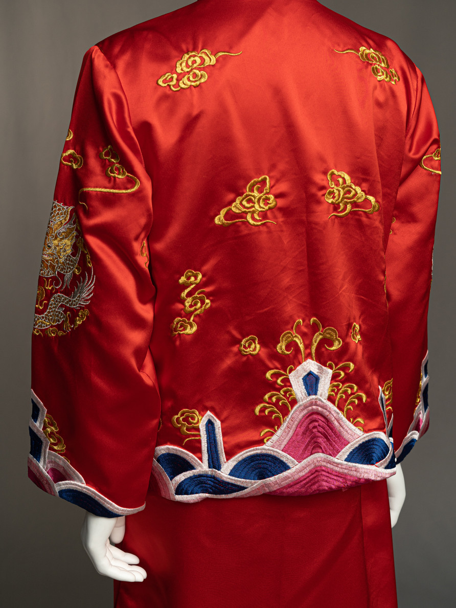 This resplendent groom’s attire is a celebration of imperial grandeur and timeless symbolism. Crafted from luxurious crimson satin, it features intricate gold and silver thread embroidery depicting coiled dragons — emblematic of power, strength, and noble virtue.