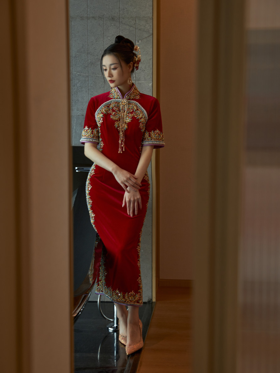 This luxurious Qi Pao (Cheongsam) exudes sophistication with its rich burgundy velvet fabric and exquisite golden embroidery. The dress is adorned with intricate floral patterns that cascade down the bodice and hem, creating a striking contrast against the deep red hue.