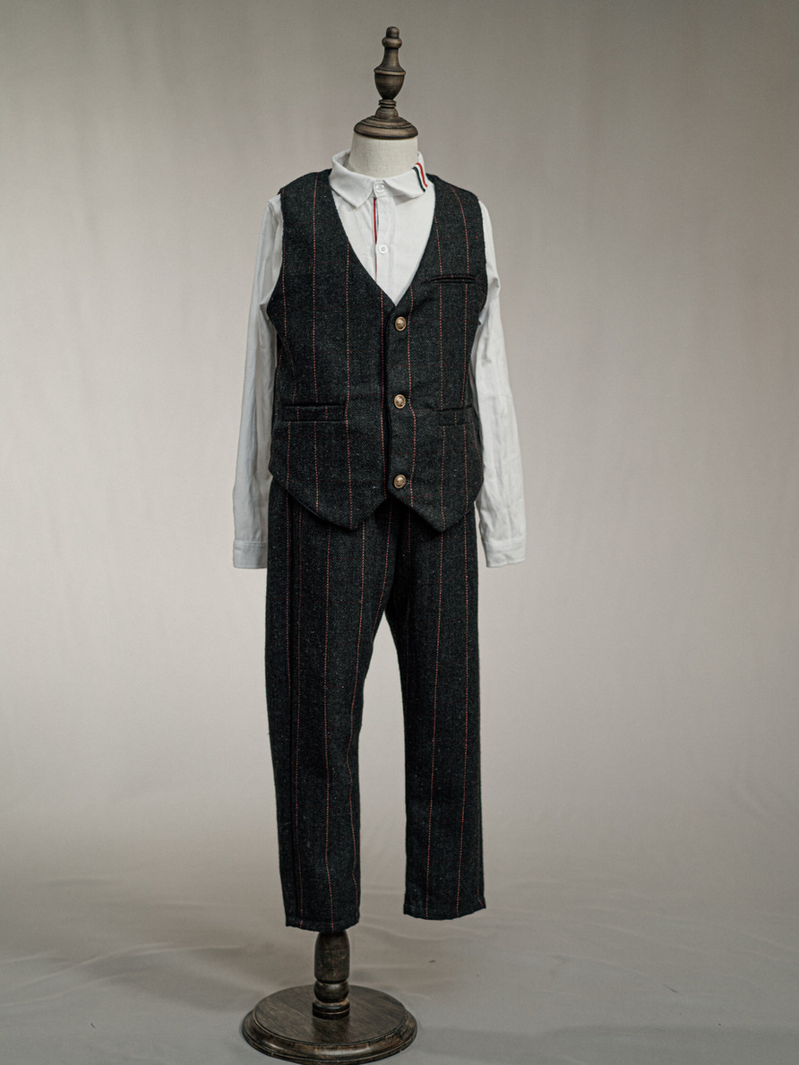 This classic boys' suit set channels vintage charm with a modern twist. The tailored vest features a rich charcoal herringbone fabric with subtle red pinstripes, exuding sophistication and character. Paired with matching trousers and a crisp white shirt detailed with a hint of red and navy on the placket, this outfit is perfect for making stylish statements at formal events.