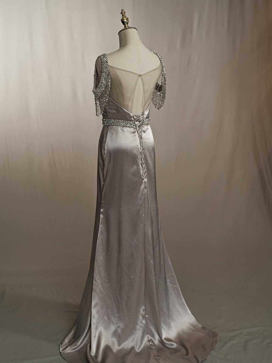 The Lunaria Drape Gown is a graceful study in movement, luxury, and detail. Crafted in a silken, moonlit silver fabric, this gown features a sculpted bodice with an illusion neckline and dazzling crystal-draped shoulder chains.