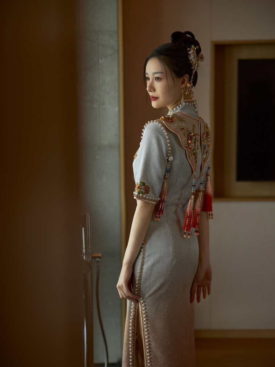 The mandarin collar and form-fitting silhouette add sophistication, while the side slits ensure ease of movement. Perfect for weddings, gala events, and festive occasions, this Qi Pao exudes charm and grace.