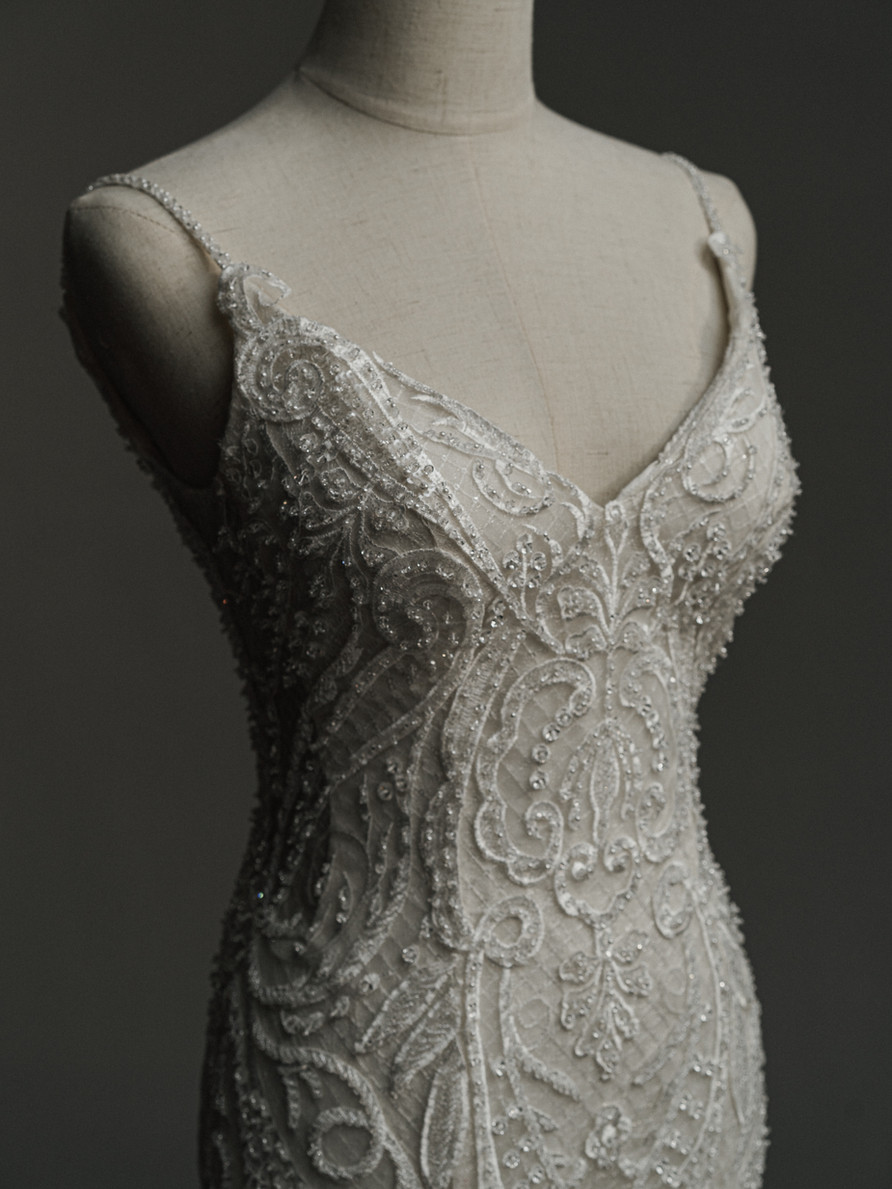 Embellishments: Hand-sewn beads, lace appliqué, and shimmering details