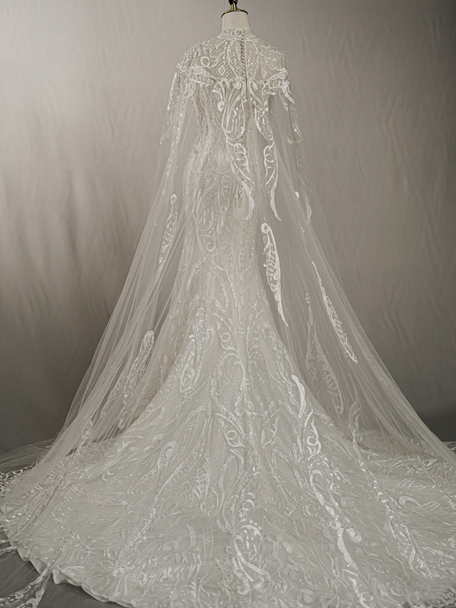 The gown’s sheer, flowing sleeves cascade elegantly down the arms, creating a dramatic and ethereal effect. The full skirt, adorned with luxurious lace and beads, trails into a breathtaking train, making it the perfect choice for the bride who desires both sophistication and grandeur.