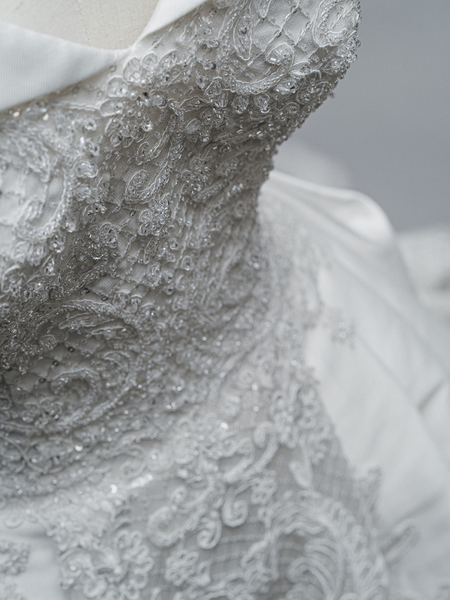 Embellishments: Hand-sewn beads, delicate lace motifs