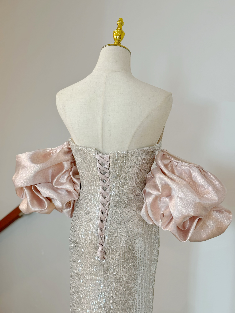 Embellishments: Pleated bodice with minimal sparkle for understated elegance